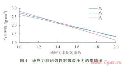 圖7為3種破裂壓力隨孔隙壓力的變化規(guī)律,計算時保持構造應力系數(shù)不變,只改變孔隙壓力的大小。當?shù)貙涌紫秹毫Ξ斄棵芏扔?span lang="EN-US">l.0g/cm3 上升到2.0g/cm3時,3種破裂壓力都近似呈線性增大,但rc增長速率遠小于ra和rb;當孔隙壓力當量密度小于1.5g/cm3時,井壁首先發(fā)生A型剪切破裂;當孔隙壓力當量密度大于1.5g/cm3時,首先發(fā)生拉伸破裂,即孔隙壓力越大發(fā)生拉伸破裂的可能性越大。