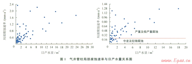 根據(jù)歷年油管腐蝕測試結果,結合氣井產水量對應的最大局部腐蝕速率的影響(圖1),可以看出,氣井油管腐蝕程度與氣井產水量關系密切,氣井腐蝕速率隨著氣井產水量的增加而增長。中度及輕微腐蝕氣井主要分布于日產水量小于2m3的氣井,嚴重和極嚴重腐蝕氣井主要分布于日產水量大于2m3的產水氣井。