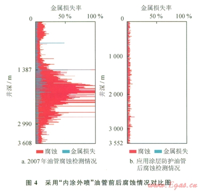 結果表明:應用DPC內涂層+外雙金屬復合噴涂技術油管后,檢測發(fā)現(xiàn)油管內壁腐蝕輕微,最大腐蝕量控制在本體的l0%以內,腐蝕速率最大為0.11mm/a。通過前后兩種氣井管柱腐蝕狀況對比,發(fā)現(xiàn)該油管防腐效果良好。截至目前,該井油管使用時間已超過5年,生產正常。