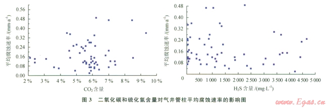 CO2和H2S含量對氣井管柱腐蝕速率的關系如圖3所示。CO2含量大于4%時,油管腐蝕速率隨CO2升高而上升。由于H2S含量比較低,其對管柱腐蝕的影響很小。