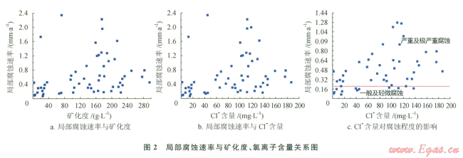 根據(jù)歷年油管腐蝕檢測結果,結合氣井產水量與氣井產出水礦化度和Cl含量對應局部腐蝕速率的關系見圖2。