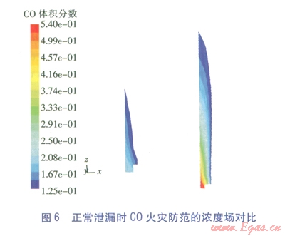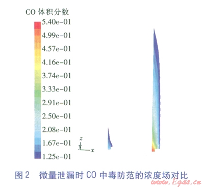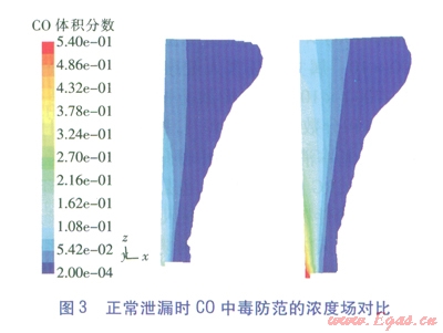 值得一提的是,火災(zāi)防范時只將爆炸極限列為危害區(qū)間,這符合不發(fā)生明火時的氣體冷態(tài)擴(kuò)散情況,但一旦發(fā)生燃燒,C0的濃度場將發(fā)生極大變化,還將產(chǎn)生對人員窒息的煙氣。FLUENT作為一款功能強(qiáng)大的軟件,也能模擬燃燒情況(俗稱熱態(tài)研究),但這將大大增加參數(shù)設(shè)定的復(fù)雜性和計(jì)算過程冗時性,這是工程計(jì)算力求避免的,但應(yīng)是理論研究的改進(jìn)方向。