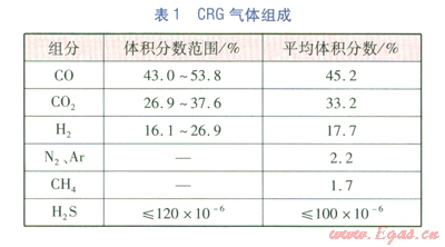 CRG是在COREX非高爐煉鐵反應(yīng)時產(chǎn)生的氣體,屬于人工煤氣,沒計(jì)輸送壓力為0.2 MPa,標(biāo)準(zhǔn)狀態(tài)下的低熱值為8.231MJ/m3,其一氧化碳含量較高,氣體組成見表1。
