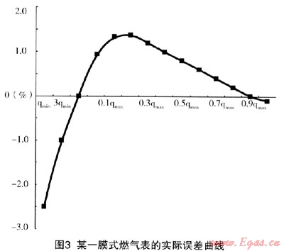 理想情況下燃氣表計量誤差是零,但是流量計均存在實際誤差曲線。按照設計圖生產(chǎn)的一批燃氣表,誤差曲線應該是一樣的,但是,因為實際生產(chǎn)工藝、裝配等因素影響,實際上每一臺表的誤差曲線是不同的[2]。圖3為某一膜式燃氣表的實際典型的誤差曲線,其中橫坐標x軸為檢定的流量點,縱坐標Y軸為相對誤差值(%)。