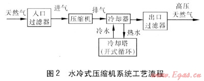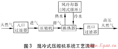 天然氣從入口過濾器進(jìn)入壓縮機(jī),增壓后的氣體進(jìn)入換熱器列管中,與列管外的冷水進(jìn)行換熱,冷水把氣體放出的熱量吸收并帶走至風(fēng)冷卻器,冷卻系統(tǒng)完全封閉,循環(huán)水在冷熱交換時不和環(huán)境空氣接觸,熱水被風(fēng)冷卻器風(fēng)扇強(qiáng)制冷卻,降溫后的冷卻水通過水泵循環(huán)至換熱器。高壓天然氣被冷卻后,通過出口過濾器,流進(jìn)下一步工序。