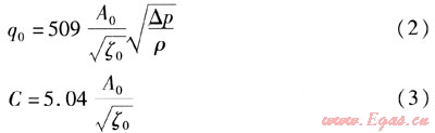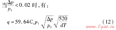 C是由生產(chǎn)廠家提出的調(diào)壓器的流通能力系數(shù),其物理意義為:在介質(zhì)密度ρ為1000kg/m3、壓差△p=0.0981MPa、調(diào)壓器全開的條件下,通過調(diào)壓器的流量,單位是m3/h。用戶根據(jù)需要的壓差和氣體的密度就可以用式(2)算出調(diào)壓器全開時(shí)的流量。