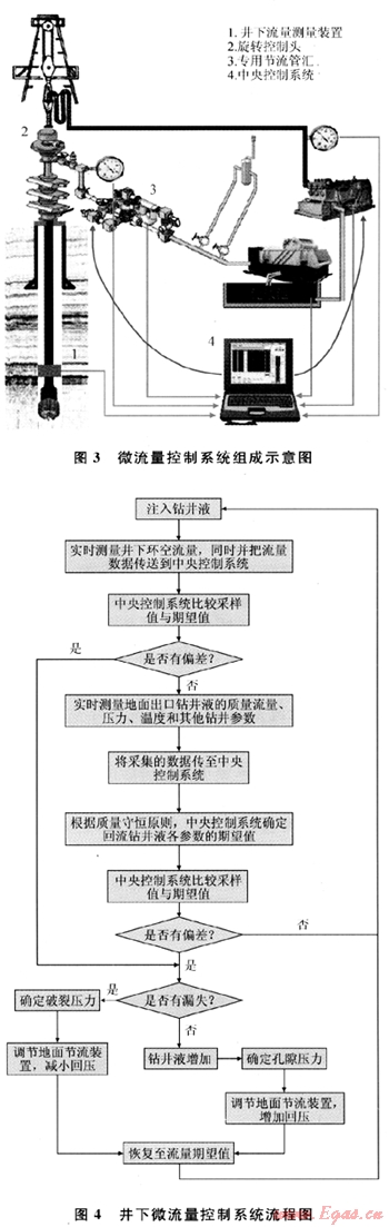 鉆井過程控制流程圖如圖4所示。在鉆井過程中實時監(jiān)測井下環(huán)空流量,并通過MWD把數(shù)據(jù)輸送至地面與環(huán)空流量期望值進(jìn)行比較,不同井段和工況下環(huán)空鉆井液流量有不同的期望值。當(dāng)兩者存在偏差時,系統(tǒng)進(jìn)一步判斷鉆井液是否有漏失。如有漏失,系統(tǒng)可確定破裂壓力,并減小井口回壓;如無漏失或產(chǎn)生溢流,則可確定孔隙壓力,并適當(dāng)增大井口回壓;當(dāng)兩者一致時,為了判斷井下是否存在其他單靠井下流量測試裝置無法發(fā)現(xiàn)的復(fù)雜情況(例如低于井下流量測試裝置測量精度的微小溢流或漏失),中央控制系統(tǒng)則通過把地面鉆井液流量、壓力、溫度以及泥漿池液面變化等數(shù)據(jù)與期望值進(jìn)行比較來判斷,若與期望值相符,則表示鉆井作業(yè)正常,否則就要采取相應(yīng)控制措施。這種監(jiān)測與比較將一直進(jìn)行下去,實現(xiàn)鉆井作業(yè)時鉆井液的可控循環(huán),實時監(jiān)測孔隙壓力和破裂壓力,并根據(jù)需要調(diào)節(jié)節(jié)流閥的開度來控制井口回壓,以滿足鉆井工藝要求。圖4為井下微流量控制系統(tǒng)流程圖。