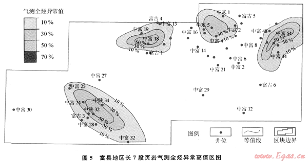 綜合考慮上述影響因素,繪制的長(zhǎng)7段頁(yè)巖氣測(cè)全烴異常高值區(qū)圖顯示(圖5)