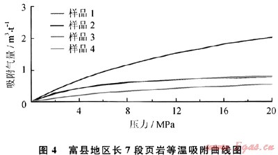為了解該區(qū)頁(yè)巖的吸附能力,在鉆井巖心中采集4個(gè)樣品進(jìn)行等溫吸附試驗(yàn),試驗(yàn)條件為:試驗(yàn)溫度為35℃(大約相當(dāng)于1000m埋深的地溫),采用純甲烷在平衡濕度條件進(jìn)行,試驗(yàn)結(jié)果為:蘭氏體積為0.98~3.96cm3/g,平均為1.75cm3/g;蘭氏壓力為5.19~19.23MPa,平均為11.89MPa(圖4)。