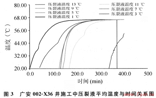 從圖3可見,階段1壓裂液90m3,從地表20℃升溫到65℃需要100min,即施工100min后階段1壓裂液才升溫到地層溫度,同樣階段3壓裂液在施工180min后才升溫到地層溫度,對于階段13來說,施工結(jié)束后,該段壓裂液的溫度才只有50℃。
