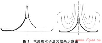 1) 采用創(chuàng)新設(shè)計(jì)的傘形氣流旋水子部件,其結(jié)構(gòu)及效果示意圖如圖2所示,以達(dá)到煙氣含濕的目的,從而保證上盤管受熱面的安全運(yùn)行,強(qiáng)化傳熱。該技術(shù)方案的優(yōu)點(diǎn)在于:①當(dāng)高溫?zé)煔馀c水大面積接觸時(shí)發(fā)生了熱質(zhì)交換,加熱并部分蒸發(fā)了水,適當(dāng)降低了煙溫,使流經(jīng)上盤管受熱面的煙氣溫度不致過高,能夠控制在天然氣燃點(diǎn)溫度650℃以下[12],從而確保加熱氣化裝置的安全運(yùn)行;②因?yàn)樯媳P管內(nèi)的工質(zhì)是溫度很低的LNG,適當(dāng)降低的煙溫將使上盤管受熱面內(nèi)外的工質(zhì)溫差不致太大,從而避免了盤管因熱應(yīng)力損壞,也避免了必須采用優(yōu)質(zhì)鋼材而使造價(jià)上升;③帶有水滴、霧和蒸汽的濕煙氣在換熱時(shí),發(fā)生凝結(jié)放熱,從而有效地提高了傳熱效果。該技術(shù)是原始創(chuàng)新技術(shù),因此采用該技術(shù)的LNG加熱氣化裝置是一種全新的設(shè)計(jì)。