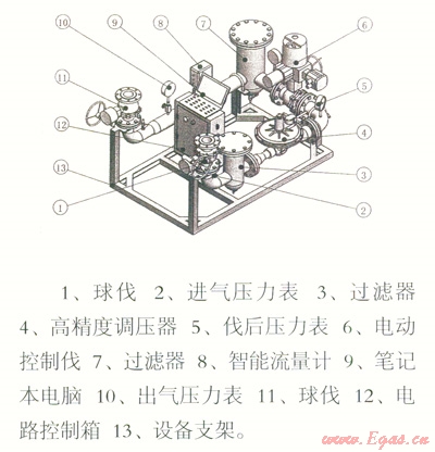 (2)、在“置換裝置”的電腦鍵盤上輸入球罐進(jìn)氣管道的公稱直徑,裝置即行啟動(dòng),按電腦軟件所設(shè)定的3米/秒流速和5~100kpa壓力自動(dòng)向球罐的進(jìn)氣管道內(nèi)輸送天然氣進(jìn)行“浸灌”(注:因球罐的容積比球罐進(jìn)氣管道的容積至少大數(shù)十倍,因此進(jìn)入球罐的氣體流速是極低極低的,所以稱為“浸灌”)。