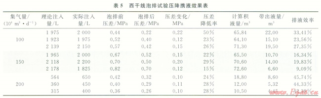 根據(jù)西干線泡排實驗數(shù)據(jù),評價泡排前后的壓差和排液效果變化,試驗壓降和攜液結(jié)果見表5。從表5可以看出:①隨著泡排劑的注入,輸送壓差總體呈現(xiàn)下降趨勢,如果實際注入量小于理論注入量,則導致降壓效果不佳;②在相同集氣量下,注入泡排劑量越大,壓降效果越顯著;③在相同的泡排劑注入量下,壓降與集氣量密切相關(guān),在100×104m3集氣量下,壓降為0.22MPa,集氣量為150×104m3時,最大壓降為0.20MPa,在200×104m3集氣量下,最大壓降為0.11MPa,分析認為集氣量大,氣流速度快,泡排劑與積液的作用時間短,進一步優(yōu)化注入量與集氣量、注入時間及注入制度之間的關(guān)系,確保泡排劑與積液的充分作用,以進一步提高泡排效果。