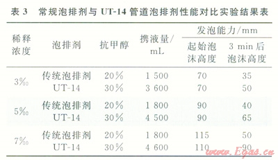 目前國內(nèi)外所使用的泡沫劑為了減少礦化度、溫度對其排液效果的影響,基本上采用陰離子表面活性劑[17],由于西干線管線積液(表2)中有大量的甲醇和凝析油,其為擴散能力很強的低分子量物質(zhì),它的存在將加快泡排劑泡沫表面的排液速度,使得泡排劑產(chǎn)生的泡沫極不穩(wěn)定,很容易破滅。為此,對管線泡沫排水劑配方研究從以下兩方面進行:①為了消除甲醇對發(fā)泡劑泡沫穩(wěn)定性的影響,對活性劑進行篩選,選用泡沫壁相對較厚且泡沫形狀呈菱形穩(wěn)定結(jié)構(gòu)的活性劑作為泡沫排水劑的發(fā)泡成分,并且加入增溶劑,以增大活性劑在配方中的溶解度,使得配方中有效發(fā)泡成分大大增加,以消除抗凍劑對泡沫排水劑發(fā)泡、帶液能力的影響;②在發(fā)泡劑分子上引入羧基基團,讓這種網(wǎng)狀基團阻礙或減慢甲醇這類擴散劑分子侵入發(fā)泡劑泡沫表面,減慢或消除甲醇對發(fā)泡劑泡沫排液的影響。取西干線清管的水樣,通過系列室內(nèi)實驗,研制出管道高抗醇、抗油的管道泡排劑UT-14,3種活性劑(a:油患子精華素;b:聚乙二醇;c:三乙醇胺)的最佳配制比例為:a:b:c=10:4:1,其發(fā)泡能力(泡沫高度)達到150mm,5min后也能保持在120mm。參照泡排劑評價相關(guān)標準,開展常規(guī)泡排劑與新研制泡排劑UT-14對比實驗,實驗結(jié)果見表3,由此叮以看出,管道泡排劑UT-14抗醇、抗油能力較好,現(xiàn)場使用濃度(體積分數(shù))為3.00‰~5.00‰,該濃度泡排劑加注后不會對下游分離沒備、管線造成影響。