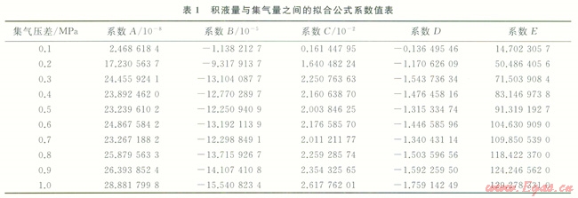 由圖2可見,給定集氣量下,集氣壓差越大,積液量越大,在相同集氣壓差下,集氣量越大,積液量越小,因為輸氣量越大,摩擦損失越大,由積液導致的壓損越小,根據(jù)模擬分析,擬合出積液量與集氣量和集氣壓差之間的關(guān)系式。