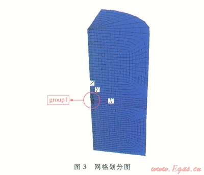圖3中,1/4圓柱體模擬儲(chǔ)氣庫(kù)溶腔周圍的地質(zhì)環(huán)境,其直徑是儲(chǔ)氣庫(kù)溶腔模型最大直徑的20倍,在網(wǎng)格中間位置可以看到儲(chǔ)氣庫(kù)溶腔輪廓的1/4。在網(wǎng)格劃分時(shí)將儲(chǔ)氣庫(kù)溶腔網(wǎng)格一起劃分,有助于儲(chǔ)氣庫(kù)溶腔的形成。在此網(wǎng)格中,定義了2個(gè)組,分別是group1和group2,前者對(duì)儲(chǔ)氣庫(kù)溶腔進(jìn)行網(wǎng)格劃分,后者對(duì)儲(chǔ)氣庫(kù)溶腔周圍地質(zhì)環(huán)境進(jìn)行網(wǎng)格劃分。選擇采用各向同性彈性模型,其材料特性常數(shù)見表1。