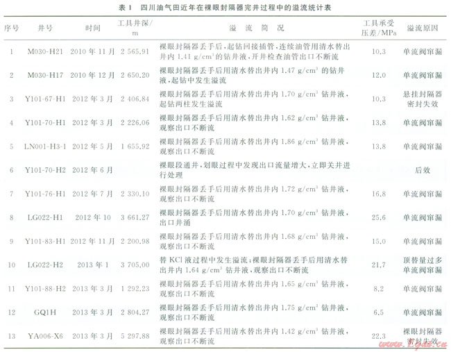 統(tǒng)計川渝地區(qū)近年在裸眼封隔器完井作業(yè)時共發(fā)生溢流有14井次(表1)。表中反映了溢流多發(fā)牛在采用KC1完井液替換裸眼段鉆井液和坐封管柱丟手后用清水替出井內(nèi)鉆井液2種工況。