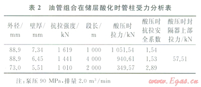 根據(jù)抗管柱在酸壓、生產(chǎn)過程中的強(qiáng)度校核,最大限度地降低生產(chǎn)成本,油管柱選擇125鋼級(jí)Æ88.9mm×7.34mm+Æ88.9mm×6.45mm+Æ73mm×5.51mm復(fù)合油管。