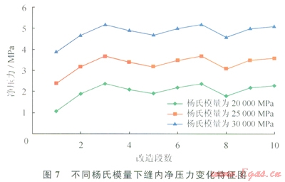 為進(jìn)一步研究儲(chǔ)層巖石力學(xué)參數(shù)對(duì)應(yīng)力陰影的影響,設(shè)置不同泊松比和楊氏模量進(jìn)行研究??疾觳此?span lang="EN-US">0.2、0.35、0.45比時(shí),結(jié)果表明泊松比對(duì)應(yīng)力陰影的影響較小,即便在泊松比為0.5的極端情況下,導(dǎo)致的凈壓力變化幅度仍不大,因此產(chǎn)生的應(yīng)力影響很小(圖6)??疾鞐钍夏A?span lang="EN-US">20000MPa、25000MPa、30000MPa等3種情況,研究表明:楊氏模量對(duì)裂縫內(nèi)凈壓力值的變化影響較大,產(chǎn)生的應(yīng)力陰影現(xiàn)象越強(qiáng)烈,楊氏模量越高對(duì)裂縫應(yīng)力陰影效果影響也較大(圖7)。因此,儲(chǔ)層巖石力學(xué)參數(shù)中楊氏模量對(duì)應(yīng)力陰影現(xiàn)象的影響最敏感。