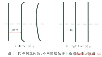 隨著工具設(shè)備及水平井改造技術(shù)的不斷進(jìn)步,儲(chǔ)層多段改造的規(guī)模、段數(shù)等越來越多[8-9]。水力壓裂沒計(jì)師可利用分簇射孔將分段改造距離設(shè)置得越來越近,但往往過多的分簇與分段未必就帶來理想的效果,Roussel認(rèn)為應(yīng)力陰影效應(yīng)的產(chǎn)生機(jī)理主要在于支撐劑的填充導(dǎo)致人工裂縫附近引起了應(yīng)力場的變化,蔣廷學(xué)等也在研究我國頁巖氣壓裂設(shè)計(jì)中指出,壓裂在單一裂縫脆弱面上產(chǎn)生誘導(dǎo)應(yīng)力的存在,并指出產(chǎn)生應(yīng)力陰影的誘導(dǎo)應(yīng)力可以改變最大與最小主應(yīng)力的分布,使裂縫發(fā)生轉(zhuǎn)向[10]。述研究表明,應(yīng)力陰影效應(yīng)可引起人工裂縫從水平井的橫切縫中開始偏離朝向或遠(yuǎn)離以前的裂縫方向延伸,使得下一裂縫發(fā)生轉(zhuǎn)向。Barnctt頁巖裂縫間距30m時(shí)水平井壓裂裂縫產(chǎn)生的應(yīng)力陰影效應(yīng)如圖1-a所示,可見從第二條裂縫開始裂縫出現(xiàn)了與主縫向切的裂縫系統(tǒng),而Eagle Ford頁巖壓裂的裂縫監(jiān)測情況,同樣是30m的裂縫間距沒有出現(xiàn)裂縫應(yīng)力陰影效應(yīng)(圖1-b)。因此研究陰影效應(yīng)的產(chǎn)生機(jī)理,建立分析數(shù)學(xué)模型并進(jìn)行其影響因素分析對(duì)水平井分段體積改造優(yōu)化設(shè)計(jì)及效果的提升具有重要研究與應(yīng)用價(jià)值。