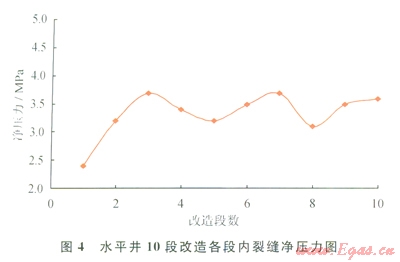 以某口致密儲(chǔ)層X水平井為例,水平段長度1043m,儲(chǔ)層有效孔隙度8%,有效滲透率0.12mD,地層孔隙壓力29.0MPa,楊氏模量25000MPa,泊松比0.2,最小水平主應(yīng)力43.2 MPa,抗張強(qiáng)度3.5MPa。分段改造設(shè)計(jì)6~10段。利用上述數(shù)學(xué)模型計(jì)算水平井10段改造下不同段內(nèi)的凈壓力及裂縫形態(tài)表明:100m的段間距內(nèi)裂縫將發(fā)牛轉(zhuǎn)向(圖4、5)。