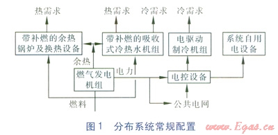 分布系統(tǒng)一般包括動力設(shè)備(主要為發(fā)電機組)、余熱利用設(shè)備(主要為帶補燃的余熱鍋爐、換熱設(shè)備、帶補燃的吸收式冷熱水機組等)、供配電設(shè)備(主要為電控設(shè)備等)、燃?xì)夤?yīng)設(shè)備、監(jiān)控裝置等,常規(guī)配置見圖1。在實際設(shè)計中,應(yīng)根據(jù)發(fā)電機組特性、用戶需求(熱電比、冷熱負(fù)荷特性)等多方面因素合理配置分布系統(tǒng),以實現(xiàn)能源的高效經(jīng)濟利用。