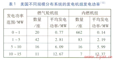 內(nèi)燃機組是將液體或氣體燃料與空氣混合后,直接輸入氣缸內(nèi)部燃燒并產(chǎn)生動力的設(shè)備,是一種將熱能轉(zhuǎn)化為機械能的熱機,具有體積小、熱效率高、啟動性能好等優(yōu)點,發(fā)電功率范圍為5~18000kW。美國不同規(guī)模分布系統(tǒng)的發(fā)電機組發(fā)電功率見表1[12]。