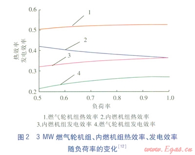 在分布系統(tǒng)中,發(fā)電機組常運行在部分負(fù)荷狀態(tài)下,其變工況特性對分布系統(tǒng)綜合性能影響較大。以發(fā)電功率均為3MW的燃?xì)廨啓C組、內(nèi)燃機組為例,熱效率、發(fā)電效率隨負(fù)荷率的變化見圖2[12]。由圖2可知,隨著負(fù)荷率的降低,兩種發(fā)電機組的發(fā)電效率均呈現(xiàn)下降趨勢,但內(nèi)燃機組的發(fā)電效率比燃?xì)廨啓C組高10%(絕對值)左右。燃?xì)廨啓C組的熱效率明顯高于內(nèi)燃機組,前者的熱效率隨著負(fù)荷率的降低而降低,后者的熱效率隨著負(fù)荷率的降低有上升趨勢。由以上分析可知,盡管兩種發(fā)電機組在額定工況下具有大致相同的熱電總效率(熱效率與發(fā)電效率之和),但內(nèi)燃機組的變工況特性更優(yōu)。