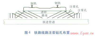 鉆孔:密切觀察鉆進尺度及溢水出水情況,出現(xiàn)涌水時,立即停鉆,先行注漿止水,再分析原因。確認止水效果后,方可繼續(xù)鉆孔。鐵路線路注漿鉆孔布置見圖4。