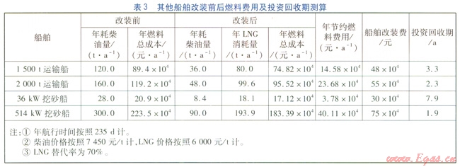 2000t級(jí)散貨船改裝前后的經(jīng)濟(jì)效益比較見表2(表2中的數(shù)據(jù)是實(shí)際運(yùn)行數(shù)據(jù)),其他幾種船舶改裝前后燃料費(fèi)用及投資回收期測(cè)算見表3。