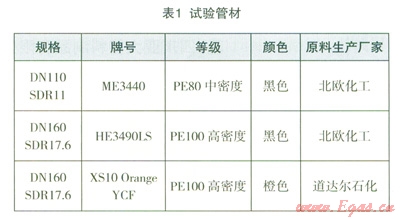 為了驗(yàn)證不同等級(jí)及有無(wú)炭黑聚乙烯燃?xì)夤懿牡奈潭?、?duì)接焊麻點(diǎn)出現(xiàn)程度及其影響大小,該試驗(yàn)分別選取了中密度聚乙烯原材料ME3440(含炭黑)、高密度聚乙烯原材料HE3490LS(含炭黑)及橙色高密度聚乙烯原材料XSl0 Orange YCF(不含炭黑)生產(chǎn)出的管材(詳見(jiàn)表1);為保證水份充分滲透,將管材浸泡在常溫水中,浸泡時(shí)間為2年。