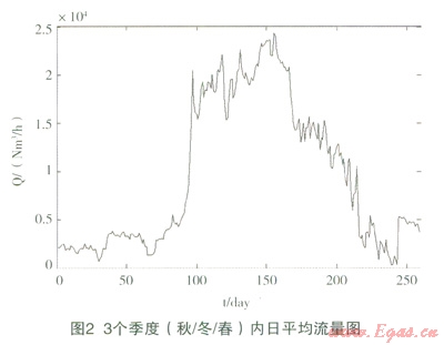 圖1表示:用氣高峰日和非高峰日內(nèi)下游用戶一天內(nèi)用氣量隨時間的變化過程;圖2表示:一年內(nèi)260天的日平均用氣量。從圖1和圖2中可以看出:高峰日和非高峰日,高峰時段和非高峰時段時,天然氣的流量變化范圍很大,在考慮性價比的情況下,實際流量計的選擇必須覆蓋流量上限。由此可能會出現(xiàn):在用氣量低谷時,實際運行流量接近或低于流量計下限,從而引起流量的測量不準確。