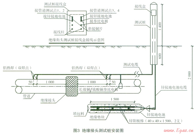 工藝專業(yè)一般都在加氣站、門站、調(diào)壓站等場(chǎng)站的進(jìn)出站管道上設(shè)有絕緣接頭。絕緣接頭的功能主要有兩個(gè),一是將陰極保護(hù)電流限制在站外管道上,防止陰極保護(hù)電流通過(guò)站內(nèi)工藝裝置的接地系統(tǒng)流失,二是將站內(nèi)設(shè)備的雜散電流隔絕在站內(nèi),防止雜散電流流到站外長(zhǎng)輸管道或者城市管網(wǎng)上造成雜散電流干擾腐蝕。但絕緣接頭只能作為隔絕管道陰極保護(hù)電流及站內(nèi)雜散電流用,而不能作為過(guò)電壓的安全防護(hù)措施用,站內(nèi)及管道上因雷擊產(chǎn)生的高電壓、站內(nèi)設(shè)備故障產(chǎn)生的高電壓、管道上因氣流摩擦而產(chǎn)生的靜電、長(zhǎng)輸管道的感應(yīng)過(guò)電壓等都會(huì)將絕緣接頭損壞。絕緣接頭一旦損壞就會(huì)對(duì)長(zhǎng)輸管道或者城市管網(wǎng)的陰極保護(hù)系統(tǒng)造成嚴(yán)重影響,甚至使陰極保護(hù)系統(tǒng)失效,所以必須為絕緣接頭添加防護(hù)措施。絕緣接頭的防護(hù)裝置主要有避雷器、電解接地電池、極化電池及二極管保護(hù)器,目前應(yīng)用最廣泛的是接地電池。接地電池是用來(lái)提供一個(gè)低電阻通道,排放強(qiáng)電電涌但不泄漏陰極保護(hù)直流電流的一種裝置,通常采用鋅材料制作[1]。