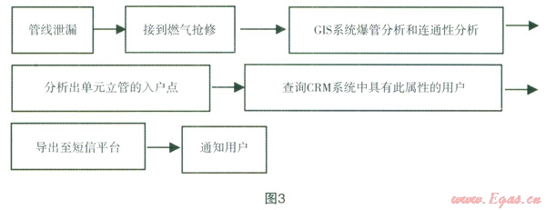 在GIS系統(tǒng)中,設(shè)置單元立管的入戶點(diǎn)為最小單元;在CRM系統(tǒng)中,增加燃?xì)庥脩羲鶎賳卧⒐苋霊酎c(diǎn)的屬性;當(dāng)出現(xiàn)燃?xì)夤艿佬孤屝迒?wèn)題時(shí),可以通過(guò)GIS系統(tǒng)中的爆管分析和連通性分析,分析出泄漏點(diǎn)所影響的單元立管入戶點(diǎn),通過(guò)調(diào)用CRM系統(tǒng)中的具有此入戶點(diǎn)屬性的用戶,分析出所影響的用戶數(shù),并調(diào)用短信平臺(tái)接口將停氣通知實(shí)時(shí)發(fā)送至用戶手機(jī)中。此種方式,提高了影響范圍用戶的準(zhǔn)確性,并縮短了通知用戶的時(shí)間。具體的過(guò)程如圖3。