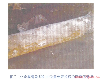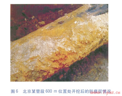 在128Hz電流測量信號的結果中(見圖4),在600m和800m左右的位置上,出現(xiàn)了防腐層質量較差的情況,對兩處位置進行定位和開挖,開挖坑內防腐層的情況分別見圖6、7。