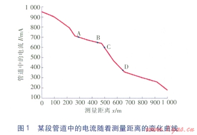 實際管道中的電流隨著測量距離變化的一般規(guī)律為:電流隨距離的增加而衰減,在管徑、管材、土壤環(huán)境不變的情況下,防腐層的絕緣性越好,電流損失越少,衰減亦越?。环粗?,若防腐層損壞,如老化、變質、脫落等,絕緣性能越差,電流損失越嚴重,衰減也就越大。某段實際管道中的電流隨著測量距離的變化曲線見圖1。