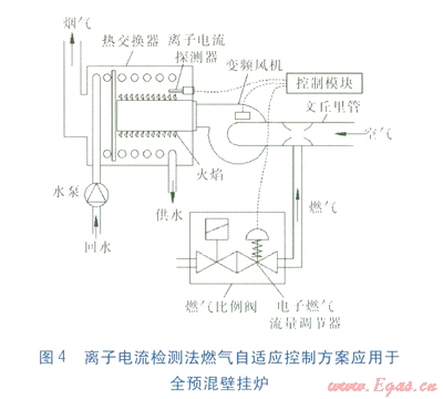 用離子電流檢測法來監(jiān)控火焰是否正常的方法已廣泛應用于現有燃具產品中。因此,離子電流檢測法應用于燃氣壁掛爐,進行燃燒工況的實時監(jiān)測是成熟的技術。傳統(tǒng)全預混壁掛爐應用的離子電流檢測法,只是檢測一個固定火焰離子電流信號,用以判斷火焰是否存在。而燃氣自適應全預混壁掛爐應用的離子電流檢測法,是通過檢測火焰離子電流信號來判斷和調節(jié)空燃比。