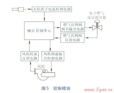 通過控制模塊根據離子電流信號來實時控制電子燃氣流量調節(jié)器及變頻風機,使產品既能滿足用戶的熱量需求,又能保證燃燒處于最佳狀態(tài)。