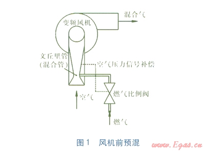 目前市場上的全預混冷凝式燃氣壁掛爐(以下簡稱全預混壁掛爐)主要有風機前預混、風機后預混兩種,分別見圖l、2。變頻風機、燃氣比例閥[2-3]提供燃燒所需的空氣與燃氣,空氣與燃氣按設定好的空燃比進行混合燃燒。