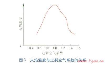 要實現穩(wěn)定的全預混燃燒,關鍵在于保持合理、穩(wěn)定的空燃比。實驗證明,全預混燃燒空燃比過大或者過小都會對燃燒造成不利影響??杖急冗^大時,多余空氣會帶走熱量,火焰溫度降低,熱效率降低;空燃比過小時,燃燒不充分,火焰溫度及熱效率亦降低。同理,當空燃比過大時,多余的空氣會稀釋離子;過小時,由于未能充分反應,燃燒過程未能產生足夠多的離子?;鹧鏈囟扰c過??諝庀禂档年P系見圖3。由圖3可知,當空燃比最佳時,火焰溫度達到峰值,火焰離子電流也達到峰值。這是離子電流檢測法用于判斷全預混燃燒空燃比的理論依據。
