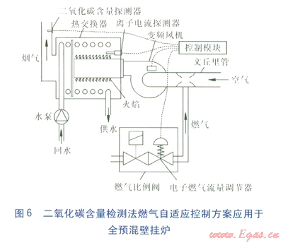 二氧化碳含量探測法燃氣自適應控制方案應用于全預混壁掛爐見圖6。其控制原理為:二氧化碳含量探測器對煙氣中的二氧化碳含量進行實時監(jiān)控,控制模塊接收二氧化碳含量探測器的信號,對信號進行邏輯分析。當二氧化碳含量偏離設置值時,控制模塊會迅速輸出電信號給電子燃氣流量調節(jié)器及變頻風機,進行控制參數調整,從而調整空燃比,使煙氣中的二氧化碳體積分數恢復到9%左右。需要說明的是二氧化碳含量檢測法燃氣自適應控制方案中也要有離子電流探測器,用以判斷火焰是否存在。