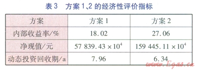 本文采用內(nèi)部收益率(稅前)、凈現(xiàn)值(稅前)、動(dòng)態(tài)投資回收期(稅前)作為方案經(jīng)濟(jì)性評(píng)價(jià)指標(biāo)。內(nèi)部收益率的經(jīng)濟(jì)含義是項(xiàng)目在其壽命期內(nèi)未回收資金的預(yù)計(jì)收益率,項(xiàng)目投入運(yùn)營后,投資額將通過每年所產(chǎn)生凈效益的形式逐步得到回收。已回收部分將用于再投資,未回收部分待繼續(xù)回收,內(nèi)部收益率就是指未回收部分的收益率,因此稱為內(nèi)部收益率。凈現(xiàn)值的經(jīng)濟(jì)含義是項(xiàng)目在其壽命期內(nèi)預(yù)計(jì)創(chuàng)造的全部凈效益。內(nèi)部收益率、凈現(xiàn)值都是反映項(xiàng)目贏利能力的指標(biāo),前者體現(xiàn)的是相對(duì)贏利能力,后者體現(xiàn)的是絕對(duì)贏利能力。內(nèi)部收益率、凈現(xiàn)值越大,項(xiàng)目贏利能力越強(qiáng)。動(dòng)態(tài)回收期越短,說明項(xiàng)目收回投資額的時(shí)間越短。方案1、2的經(jīng)濟(jì)性評(píng)價(jià)指標(biāo)見表3。由表3可知,方案2的內(nèi)部收益率、凈現(xiàn)值均高于方案l,且方案2的動(dòng)態(tài)投資回收期短于方案l,這說明方案2的經(jīng)濟(jì)性優(yōu)于方案l。