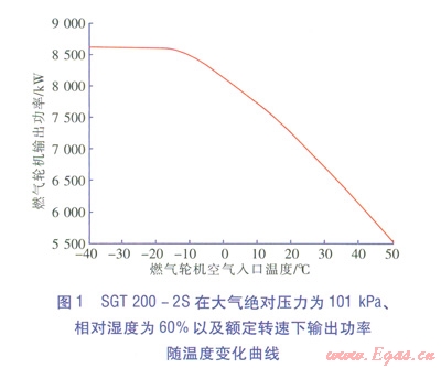 溫度升高、濕度增大固然會(huì)降低燃?xì)廨啓C(jī)的輸出功率,但是根據(jù)SGT200-2S燃?xì)廨啓C(jī)性能曲線,其設(shè)計(jì)功率能夠滿足當(dāng)?shù)馗鱾€(gè)溫度下制冷劑壓縮機(jī)的功耗要求。SGT200-2S在大氣絕對壓力為l01kPa、相對濕度為60%的設(shè)定狀況以及額定轉(zhuǎn)速下輸出功率隨溫度的變化曲線見圖l。從圖1中可以看出,即使在40℃下理論上燃?xì)廨啓C(jī)輸出功率仍能滿足制冷劑壓縮機(jī)的功耗要求。該廠所處地區(qū)夏季平均環(huán)境溫度為32.7℃,低于40℃;該地區(qū)夏季相對濕度為80%,高于燃?xì)廨啓C(jī)設(shè)定狀況下的相對濕度,可能會(huì)造成燃?xì)廨啓C(jī)輸出功率有所降低,但影響效果應(yīng)該較小[1]。
