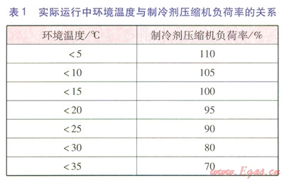 針對燃?xì)廨啓C(jī)高溫情況下易跳車的故障表現(xiàn),該工廠擬采用降低空氣入口溫度的方法解決跳車問題。其方案可行性研究報(bào)告認(rèn)為,工廠夏季平均環(huán)境溫度高達(dá)30℃,相對濕度為70%~80%,溫度高、濕度大是造成燃?xì)廨啓C(jī)輸出功率不足的主要原因。燃?xì)廨啓C(jī)額定輸出功率為7.65MW,制冷劑壓縮機(jī)設(shè)計(jì)輸入功率為6.13MW,理論上燃?xì)廨啓C(jī)應(yīng)能滿足制冷劑壓縮機(jī)滿負(fù)荷下的功率要求。但在實(shí)際運(yùn)行過程中,按照制冷劑壓縮機(jī)功率計(jì)算,夏季負(fù)荷率最高只能維持在80%左右,相當(dāng)于燃?xì)廨啓C(jī)在該環(huán)境溫度下的輸出功率僅有4.9MW左右,遠(yuǎn)低于燃?xì)廨啓C(jī)的額定輸出功率。該廠技術(shù)人員總結(jié)實(shí)際運(yùn)行經(jīng)驗(yàn),發(fā)現(xiàn)實(shí)際運(yùn)行中環(huán)境溫度與制冷劑壓縮機(jī)負(fù)荷率的關(guān)系見表l。