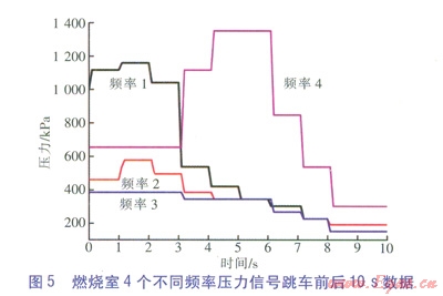 燃燒室4個(gè)不同頻率壓力信號跳車前后10s數(shù)據(jù)如圖5所示,這4個(gè)壓力信號表征燃燒室火焰振蕩特征頻段的強(qiáng)度。頻率l、頻率2、頻率3、頻率4代表頻率依次降低。從圖5可以看出,在2s左右,高頻段頻率1、頻率2的值突降,圖3和圖4中7號燃燒室的溫度也突然降低;3s左右,高頻段強(qiáng)度進(jìn)一步降低,低頻段信號頻率4突然增強(qiáng),7號燃燒室的溫度也再次下降;4s左右,這一趨勢進(jìn)一步加強(qiáng),7號燃燒室溫度也進(jìn)一步降低;6s以后,所有頻段的信號強(qiáng)度都減弱,這是因?yàn)橹?、輔燃料閥都已經(jīng)關(guān)小,燃燒室功率下降。從以上變化趨勢可以看出,火焰高頻振動(dòng)減弱、低頻振動(dòng)加強(qiáng)代表燃燒不穩(wěn)定的增強(qiáng),最后導(dǎo)致火焰被吹滅,燃燒室溫度下降。該廠現(xiàn)場操作人員也反映,燃?xì)廨啓C(jī)運(yùn)行過程中除了正常的運(yùn)行噪聲外,還有周期性的轟隆聲,這些外部表現(xiàn)與燃?xì)廨啓C(jī)熱聲振蕩燃燒現(xiàn)象非常相似。周期性的燃燒不穩(wěn)定,并且出現(xiàn)較大振幅的壓力波動(dòng),這種現(xiàn)象通常稱為熱聲振蕩燃燒。