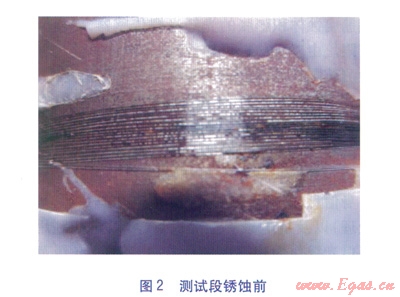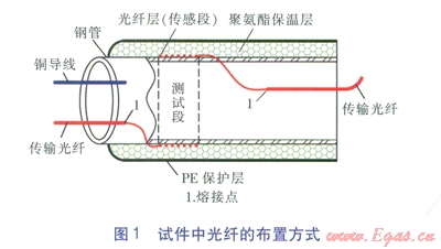 試件為一段長(zhǎng)度為200mm的鋼管(材質(zhì)為Q235),對(duì)銹蝕測(cè)試段外壁進(jìn)行拋光處理,拋光后測(cè)試段外直徑為73.8mm,壁厚為3.5m。試件中光纖的布置方式見圖l。在距鋼管端面50mm處纏繞光纖層(傳感段),纏繞時(shí)使光纖帶有一定的預(yù)應(yīng)力,保證光纖與鋼管表面緊密接觸,纏繞的光纖總長(zhǎng)度在4m左右。將光纖用環(huán)氧樹脂膠固定在鋼管上,傳感段的引出端與帶保護(hù)套的傳輸光纜熔接,將熔接處進(jìn)行保護(hù)處理,并在鋼管兩端的引出位置用環(huán)氧樹脂膠進(jìn)行固定。光纖設(shè)置完畢后,在鋼管與PE保護(hù)管間進(jìn)行發(fā)泡處理。