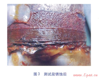 在電化學(xué)加速銹蝕的情況下,試件經(jīng)過(guò)2d持續(xù)腐蝕后,布里淵分析儀基本監(jiān)測(cè)不到應(yīng)變的變化,此時(shí)停止試驗(yàn)。測(cè)試段銹蝕前后的情況分別見圖2、3。