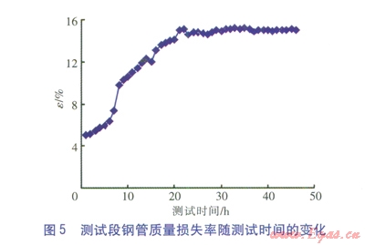 由測(cè)試結(jié)果可知,發(fā)生銹蝕前測(cè)試段外直徑D1為73.8mm,電化學(xué)加速銹蝕結(jié)束后測(cè)試段鋼管不包含銹蝕層的外直徑D1為72.8mm,代入式(2)可計(jì)算得到電化學(xué)加速銹蝕結(jié)束后測(cè)試段鋼管質(zhì)量損失率e為0.149,此時(shí)傳感段光纖的應(yīng)變?yōu)?span lang="EN-US">2161.0×10-6。由式(7)可計(jì)算得到,由銹蝕導(dǎo)致的測(cè)試段體積膨脹率h為l.16。設(shè)定在鋼管發(fā)生銹蝕后h保持不變,則可由布里淵分析儀讀取的傳感段光纖應(yīng)變及式(7)計(jì)算得到各時(shí)刻測(cè)試段鋼管質(zhì)量損失率。測(cè)試段鋼管質(zhì)量損失率隨測(cè)試時(shí)間的變化見圖5。