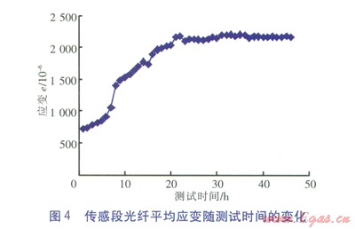 將5個(gè)連續(xù)有效測(cè)點(diǎn)的光纖平均應(yīng)變作為傳感段光纖平均應(yīng)變,傳感段光纖平均應(yīng)變隨測(cè)試時(shí)間的變化見圖4。