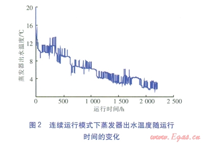 連續(xù)運(yùn)行模式下蒸發(fā)器出水溫度隨運(yùn)行時(shí)間的變化見圖2。由圖2可知,在整個(gè)供暖期內(nèi),蒸發(fā)器出水溫度持續(xù)下降。熱泵機(jī)組的制熱量根據(jù)末端負(fù)荷動(dòng)態(tài)調(diào)節(jié),蒸發(fā)器出水溫度相應(yīng)出現(xiàn)波動(dòng)。連續(xù)運(yùn)行模式下,蒸發(fā)器出水溫度低于5℃的時(shí)間約720h,約占整個(gè)供暖期的32.6%,最低為1.54℃。因此,當(dāng)采用連續(xù)運(yùn)行模式時(shí),易觸發(fā)熱泵機(jī)組的保護(hù)性停機(jī),導(dǎo)致熱泵空調(diào)系統(tǒng)無法運(yùn)行。